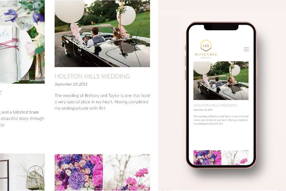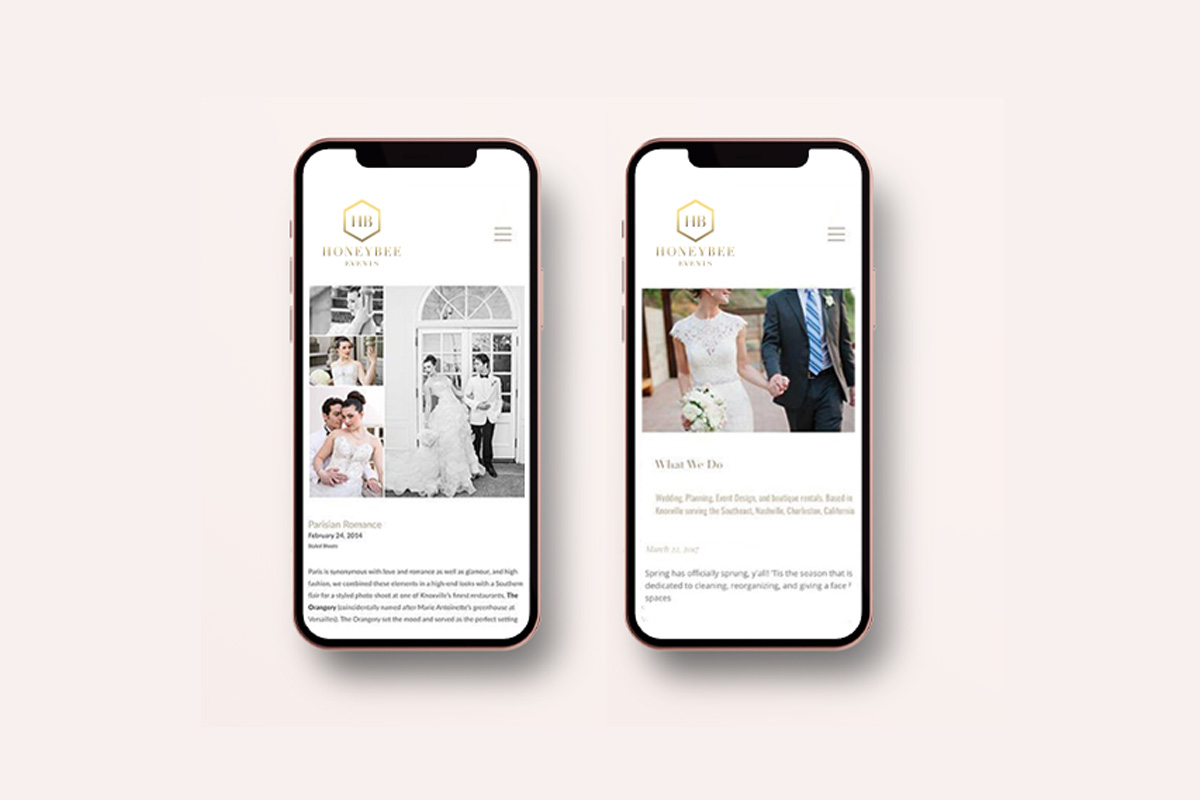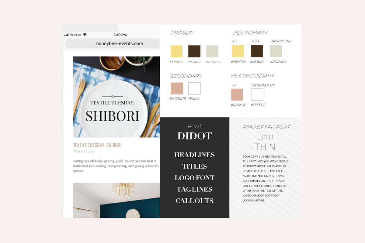 With a sophisticated gold color palette that incorporates complementary warm tones, it created a timeless brand for Honeybee Events. I created style guidelines for a cohesive look across digital materials.
